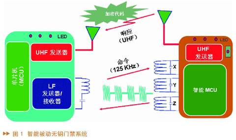 图1所示是一个智能被动无匙门禁系统,图示系统和普遍使用的系统有相似的地方也有完全不同的地方,左边基站由一个单片机和高频的发送器和低频发送器与接收器组成,基站发出125KHz的低频命令,当右面的智能接收器收到信号时会处理信号,信号达到一定的要求使用高频或低频作为响应。智能的接收器有3个接收方向XYZ,不管信号从哪个方向送来都可以接收到这个信号,而且使用者不需要任何的按钮。这样的智能接收器可以自动的接收信号、发送信号和处理信号。