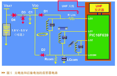 图5所示为一个具有无电池和后备电池的应答器电路,有些情况下,如果电池接触不好系统会没有电,可以用磁场来短暂的给供电,这样应答器在没有电池的情况下照样可以工作。