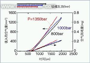 图2所示的4张照片显示了不同速度时刻燃油射束吸入空气的情景(拍摄时间以共轨喷射系统喷射开始时刻为准)。通过图片可以清楚地看出:在一开始时,空气被燃油喷射射束的尖峰向两侧排挤开来,然后形成一个复回流区;在1400μs时,照片中清楚地显示出燃油射束最大的喷射深度;在距燃油喷射尖峰几毫米处,空气被垂直地吸入燃油射束中,燃油射束的直径在距喷嘴大约25mm的位置处仍有所增加。