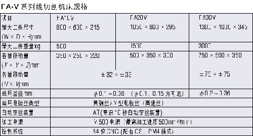FA-V系列线切割机床是由三菱电机开发出的新一代的高精度放电加工机。如图1所示。与以前的放电加工机相比,新机种的加工速度得到显著改善,最高时可达500mm2 / min,是目前世界上速度最快的电加工设备。另外,由于机床标准配备有特殊材料的加工电源,所以还可以加工以前无法用线切割机床加工的特殊材料。本系列机床在提高加工速度的同时,还可最大节约40%左右的运转成本。这些优越的性能使三菱FA-V系列线切割机床完全胜任现代汽车模具制造的需要。具体规格见下表。