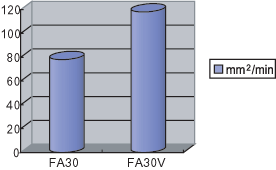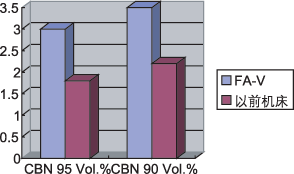 对于难加工的诸如CBN和钻石(PCD)之类的特殊材料,机床标准配备了相应的加工电源,使这些材料的加工速度和质量都得到提高。在速度方面,最明显的变化是:颗粒很大的、难加工材料的加工速度最大可提高50%。如图4 所示。在质量方面,使以前加工时最易出现问题的加工周围的破坏层减少至1/3。例如加工颗粒大小为10mm的PCD材料,用以前的电源,精加工后的表面粗糙度约为3mmRy,表面还有10mm的破坏层;而使用FA-V机床加工同样材料,表面粗糙度为1.5mmRy,表面破坏层接近零。