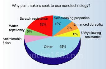 在接下来的数年内我们能取得什么样的成就呢?如图所示,从事纳米技术研究的涂料制造部门提出了当前主流的一些观点,接下来我们将分析 这些观点;但是需要肯定的一点是,还有45%"其它"的应用领域,对我们的工业部门来说,这意味着纳米技术将会有更多的、令人感兴趣的功能,对于这部分内容我们将在本月的评论中进行讨论。