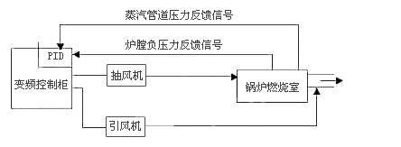 1.引风控制:通过炉膛上的负压变送器将炉膛压力标准电信号送入引风变频器PID控制器的反馈通道,经处理后与设定炉膛负压力比较,经过PID控制器产生运算信号,此信号控制引风变频器调节电机转速,使炉内负压稳定在设定值,从而达到自动跟踪鼓风保持炉膛负压恒定目的。引风电机速度随着炉膛负压值的变化而变化。即保证锅炉燃烧部分的自动运行。
