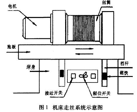 快走丝线切割机床的走丝机构,是影响其加工质量及加工稳定性的关键部件。走丝机构的功能是带动电极丝按一定线速度移动往复运丝,并将电极丝整齐地排绕在储丝筒上。储丝筒本身作高速正反向转动,是利用电动机正反转来达到的。电机经联轴器带动丝筒,再经同步带带动丝杠转动,拖板便作往复运动,拖板移动的行程可由调整换向左右撞块的距离来达到。机床走丝机构如图1所示。