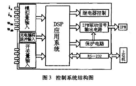 使用DSP作为控制器能最大限度地减少外围器件的数目,增加系统的稳定性。在本设计中主要使用1MS32OC24Ox DSP的PWM输出口,及板上A/D口、捕获接口CAP。DSP的6个PWM信号经过缓冲器反相后送到驱动电路板驱动IPM。控制系统结构图如图3所示