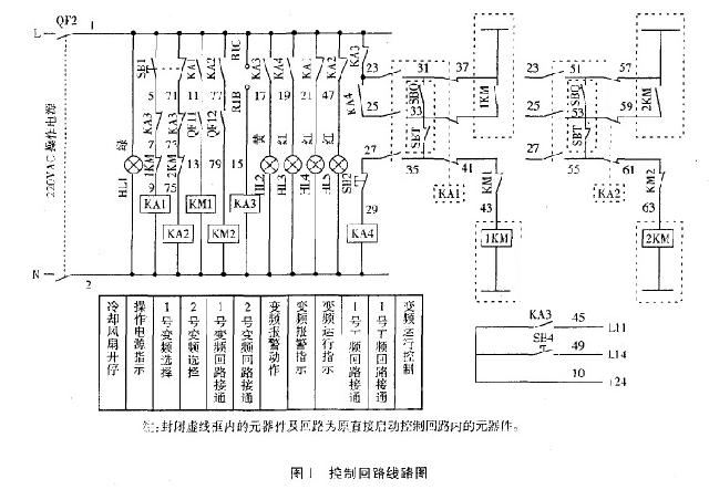 2台水泵电动机的原控制回路均保留作为新控制系统的工频旁路,由变频柜上的工频/变频选择转换开关确定。2台水泵电机工变频之间以及相互变频之间都有电气连锁,避免误操作。电气控制回路线路见图1。
