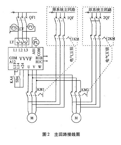 由于原工频主回路采用了长沙奥托型号为QB4200的交流电动机软启动器,为了保证改造后不影响工频的顺利启动,必须将变频器电动机主回路输出接线端接自软起动器的输出端,见图2。