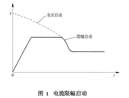 电流限幅启动是在电动机启动的初始阶段启动电流逐渐增加,通过电流反馈实施闭环控制,当电流达到预先设定的值后保持恒定,直至启动完毕,如图1所示。在实际应用中,启动电流上升变化的速率可以根据电动机负载调整设定,电流上升速率大,则启动转矩大、启动时间短。这种启动方式能实现连续转变的启动控制无突跳现象,可实现电动机平滑启动并大大减少机械传动部分的冲击,大大延长机械传动系统的使用寿命,实际应用也较多。