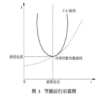 软启动器具有轻载节能的功能(如图2所示) 。在电动机启动完后的运行当中实时检测电动机的功率因数(功率因数随电动机的负载轻重而变化,负载率低时功率因数小,反之就大) ,若功率因数小,则通过CPU给出指令使电动机的端电压降低,反之升高。轻载时,电动机的工作电压降低,使电动机的铜损和铁损降低,从而达到节能目的。