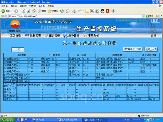 大庆油田采油八厂生产数据采集平台从功能上可分为三级:队级(包括计量间、中转站、联合站)的生产数据采集、存储、传输、显示;矿级生产数据汇总、统计、显示;厂级生产数据汇总、统计、显示。生产信息以网页形式发布,管理者通过IE进行远程浏览。