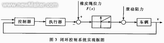 图2为试验车辆与滑车之间连接的示意图。由于滑车与被测试车辆间只有推力,其非线性特性和动力的时变特性给控制系统的实现增加了难度。"闭环"系统实现的框图如3所示。