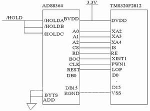 TMS320F2812芯片上有一个12位、转换频率为25MHz的ADC,其前端为两个8选1的多路转换器和两路同时采样/保持器。在要求不很高时,完全可利用其构成同步顺序采样电路,或者增加外部采样保持器后构成同步采样。考虑到本系统对电量采集精度和速度的要求较高,采样模块中选用了外置的六通道16位ADC ADS8364。该器件内部包括6个高速采样-保持放大器、6个高速ADC、一个参考电压源及3个参考电压缓冲器,可以提供250KSPS的同步采样率,还可提供具有超低功耗(69mW/每通道)的所有6个输入通道的转换,这样使得所有通道的单位成本均较低。6个通道的数据输出接口电压介于2.7~5.5V,便于与DSP直接接口,省去了中间的电平转换。6个完全独立的ADC可大大提高硬件整体的并行处理速度,在50kHz输入信号下仍可保证大于80dB的卓越共模抑制能力,特别适合用于高干扰环境。图4为ADS8364与TMS320F2812的接口电路。