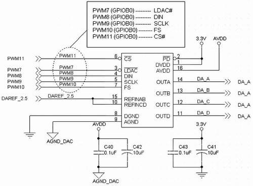 在设计中,D/A电路采用了2.5V的参考电压,为了控制方便,在控制D/A时,使用TMS320F2812的GPIOB作为转换芯片控制线,电路如图5所示。