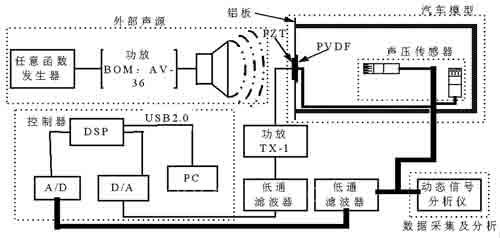 在实验系统中,采用外部扬声器模拟舱体从外部受到的激励。扬声器发出的声波迫使汽车模型的一个由铝板构成的面发生受迫振动,从而使汽车内部出现较大的噪声;当放置在箱体内部指定位置的声压传感器检测到该处的声压变化,就把最新的声压值向DSP控制器传送,控制器根据此时系统的输入和输出情况,及时做出判断,对系统施加控制,此控制功能是通过粘贴在封闭舱体薄铝板壁上的PZT执行器完成的,因为PZT在控制信号的作用下能够产生振动能量,同样使铝板受迫振动,以此来降低汽车内部指定位置的噪声。