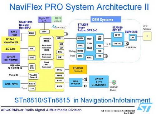 ST的Nomadik应用处理器采用以ARM为控制核心搭配多颗硬件或DSP加速器,以达成最佳化的处理效能多核心分布式处理的架构,满足了车载Telematics系统的技术需求。