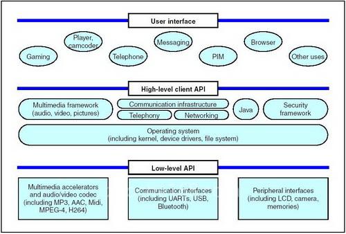 底层硬件设备包括多媒体加速器/音视频编译码器、UART接口、USB接口、Bluetooth等通讯接口,以及LCD控制器、照相机等一般性应用的标准硬件接口;中间部分主要包含处理核心、设备驱动程序和文件系统的操作系统功能,以及多媒体架构、语音及网络的通讯架构、Java和安全性架构等;语音、游戏、短信、浏览、PIM等功能位于上层的应用软件部分。