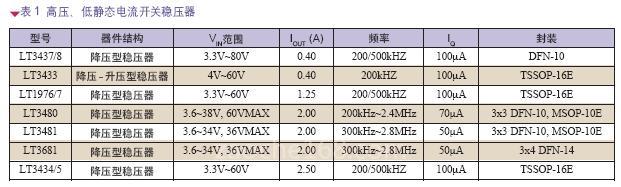 为了更好地控制这些需求,几家汽车制造商为始终保持接通的 DC/DC 转换器确定了 100mA 的低静态电流目标。直到最近,一直要求系统制造商给降压型稳压器并联一个低静态电流 LDO,每次汽车点火装置关闭后,都要从转换器切换到电流低得多的 LDO。这样的解决方案昂贵、笨重且效率相对较低。凌力尔特公司提供了 36V~60V 输入、<100mA 的降压型 DC/DC 转换器,如表 1 所示。能以突发模式(Burst Mode)工作的开关稳压器可组成紧凑得多、效率也高得多的解决方案,可解决始终保持接通带来的问题。