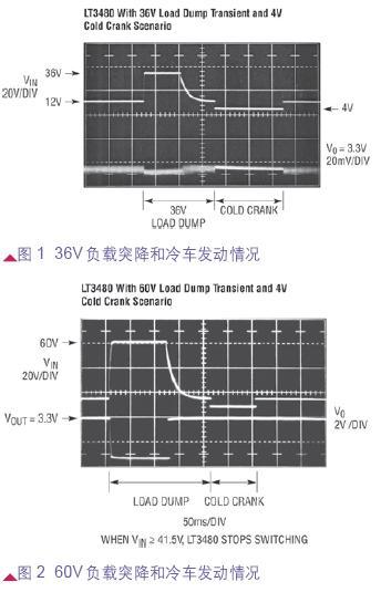 负载突降是交流发电机正在给电池充电而电池电缆断接时出现的情况。在汽车正在工作时电池电缆松动或汽车运转时电池电缆断裂,都可能发生负载突降情况。在交流发电机试图全力充电时电池电缆突然断接,可能产生高达60V的瞬态电压尖峰(见图1和图2中的36V和60V瞬态图形)。交流发电机上的瞬态电压抑制器通常将总线电压箝位在36V到60V之间,并吸收大部分浪涌电流。不过,交流发电机的下游器件DC/DC转换器要承受这些36V至60V的瞬态尖峰。由于这些转换器和由转换器供电的子系统在这种瞬态事件发生期间不能损坏,而且在某些情况下还要稳定输出电压,因此DC/DC转换器能够处理这些高压瞬态是至关重要的。可以在外部实现各种保护电路(通常是瞬态电压抑制器),但是外部电路提高了成本,而且需要占用宝贵的空间。