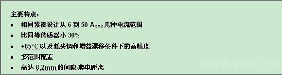 新型传感器的设计特别针对驱动器和逆变器所使用的先进技术,这些先进技术要求以下方面具有更好的性能,其中包括共模影响、热漂移(失调和增益;根据不同的型号,对于基准电压获得从7到30 ppm/K的最大热漂移)、反应时间(小于0.3微秒)、绝缘等级和尺寸。