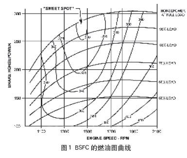 图1中的曲线为BSFC(Brake Specific Fuel Consumption)曲线,即制动下的具体燃油消耗, 具体解释如下:
