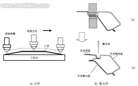 激光焊接在汽车制造中的另一个重要应用是汽车车身框架的激光焊接,其中一个典型例子就是汽车车身顶盖与车身侧板的焊接。传统的焊接方法为点焊,如图4a 所示,但现在正逐渐被激光焊接所代替(图4b)。比较两者可以看出,采用激光焊接后,顶盖和侧面车身的搭接边宽度减少,降低了钢板使用量,同时提高了车体的刚度。目前这种车身框架的激光焊接技术在各大汽车制造商的较新型车中都得到了非常广泛的应用,例如Audi A2 车体框架是由铝合金材料焊接而成,比同样结构使用钢材可减少重量43kg,其中激光焊接的焊缝总长多达30m。国内,上海通用的Polo、上海大众Passat 车型和一汽Bora 的制造中,也都采用了激光焊接技术。这是我国汽车制造业真正使用激光焊接技术的一个重要标志。
