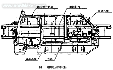 N1车装焊线的设计吸取了国外先进的装焊线技术,采用了先进的升降系统和水平输送机系统结构作为成线主体,采用计算机控制系统现场总线控制,利用自动上、下线装置来完成主要部件总成的自动输送,进行装配定位和焊接,使该线成为国内具有较先进水平的焊装线。N1车是上汽通用五菱汽车股份有限公司自行设计开发、符合国家安全、环保法规的新产品,为使新产品能尽快地上规模,公司决定,利用现代技术进行设备改造,自行设计制造一条具有国内较先进水平的装焊生产线,用于N1车装焊生产。汽车侧围总成是汽车车身制造的关键部位,它的制造质量直接影响到汽车的外观和性能。下面就侧围总成装焊拼台的设计制造进行详细介绍。