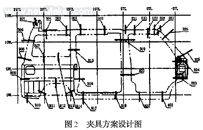 c、由于车身外形尺寸大,定位元件由多个定位板构成车身表面的空间形形状,夹具的装配、调整工作量大。