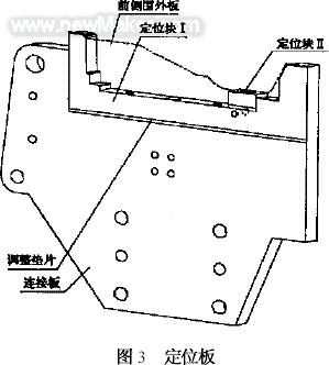 由于车身冲压件外形复杂,在装焊过程中与定位板的定位面相接触,这就决定了定位面形状复杂,尺寸精度要求较高。为了使元件的制造、调整和维修方便,将定位板设计成分离式结构,如图3 所示,定位块Ⅱ固定在定位块Ⅰ上,定位块Ⅰ固定在连接板上,通过调整垫片数量的增减来调整定位块Ⅰ和定位块Ⅱ的位置。定位块Ⅰ与连接板之间的连接方式采用孔销定位、螺栓连接,通过销的位置精度(±0102mm ) 来保证定位板的定位精度。