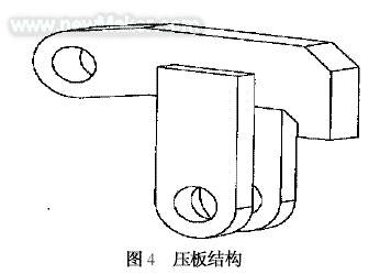 压板与工件接触部分的形状也是由工件的形面决定的。在设计过程中,要充分考虑压板打开状态的角度,应便于焊件的装卸和工人的操作,也不能与相邻夹具之间干涉。夹具B24采用气动夹紧机构,夹紧件的结构设计采用一节销形式。在设计压板时,将所需的前侧围外板形面数模用Wave Geometry Linker链接到压板的UG数模图中,使压板与工件建立了相互关系,根据定位面的外形作出压板的实体,将压板的实体与所链接的形面相切,所得到压板的定位形面与与其相接触的形面数模完全相吻合,用Hole打各特征孔,即可得到压板的数模,如图4 所示,通过连接销轴的位置精度(±0.1) 和尺寸加工精度(.dH7) 来保证压板的工作精度。