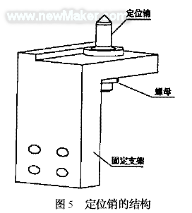 根据工件的形状及其定位孔的位置,因定位销的位置与定位基准面不一致,需设计一个固定支架将销固定在定位板上,结构如图5。定位销的直径的大小略小于工件上的孔径,其位置精度为±0.1mm ,尺寸公差为0~-0.1mm。在设计固定支架时,根据已知的定位板与定位孔间的距离,做出固定支架实体,用Hole 打各特征孔,即可得到固定支架的数模。在设计定位销时,根据已知定位孔的直径,用Sketch 和Ex2truded 作出的定位销实体,即可得到定位销的数模。