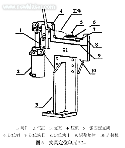根据上述特点及实践经验,侧围总成夹具的定位夹紧单元基本结构由定位板连接板、定位块、调整垫片、压板、定位销、夹紧机构等组成。夹紧机构主要是采用手动夹紧和气动夹紧两种,其选择与方案一致。在夹具的结构设计时,我们应用U G三维软件进行设计,U G 软件具有强大的曲面造型功能和实体造型功能。下面以夹具定位夹紧单元B24 的设计为例进行详细介绍。