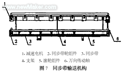 侧围总成装焊线的输送机构采用同步带传动,主要由减速电机组件、万向传动轴、同步带、支架、同步带轮及滚轮组件等构成,如图7 所示。用减速电机来驱动同步带,用万向传动轴将两边的同步带轮连接,使两边输送带的运动同步,同时,工件由两边同步带输送,可以防止其滑动的现象。该机构具有结构简单、紧凑,传动平稳,传动比准确,造价低廉,不需要润滑和缓冲吸振等特点,能保证工件的同步输送。