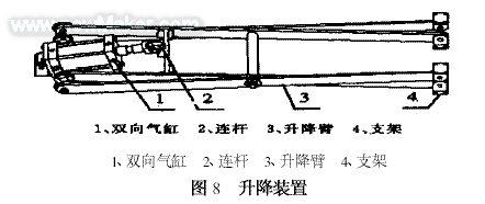 该线的升降装置采用剪刀式,如图8 所示,由双向气缸、连杆、升降臂、支座等部分组成,用双向气缸推动连杆使交叉臂上、下运动,可将输送装置抬升600mm。该系统结构简单,有足够的强度和刚度,能保证工件的同步升起、落下,无冲击。