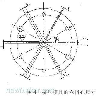 考虑到半固态铝合金触变充型中的流变特征,我们将挤压模具设计成指形模。指形模选择为六指形,六指在同一平面,为辐射形分布。六指孔尺寸分别为6X3mm,6X4mm,6X5mm,6X6mm,6X7mm,6X8mm,研究半固态材料流动规律和填充性能,探索不同工艺参数与成形流动性的关系。考虑到金属的偏流现象,将孔型的体积分布尽可能对称。实际挤压模具的六指孔尺寸分布如图4所示。图5为挤压模具装配图。图6为触变成形实验装置示意图。