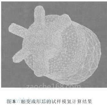 图8为在相同的实验条件下用DEFROM商用软件进行的模拟计算结果。从图7和图8中可以看出,充型过程中的半固态金属自由表面为较平滑的变形的抛物面,而模拟计算结果为标准抛物面。充型过程中指形模的的流动长度与模拟结果很相似,这说明二者的拟合度很好。同时也证明了我们设计的实验装置的实用性和模拟计算结果的正确性。