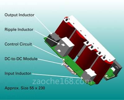 近期,两种总线电压很可能会共存在同一平台上。14V总线仍然颇具吸引力,因为目前已在14V环境下开发了大量功能。因此,需要在两种总线之间引入双向直流到直流转换器进行动力穿梭传送,这也将成为系统架构的关键部分,因为需要该转换器为14V条件下的汽车发动提供必要的动力。为了尽可能降低成本并增加动力密度,转换器可以与电机驱动集成:共享相同的总线电容、母线布局和热交换器。图6显示了与ISA共享总线电容的1.5kW转换器,该转换器采用了一种称为“波纹转向(ripple steering)”的非传统拓朴结构,这种结构可以尽可能降低电抗器件的规格。转换器的转换效率为92%,偏差为5%或0.7V,动力密度为2W/cm3。