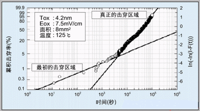 图1:恒压条件下4.2nm氧化膜的TDDB评测结果(注意早期击穿区域产生的偶发性故障)。