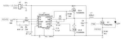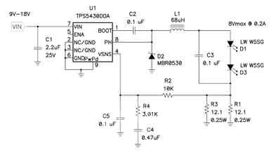 在输出电压始终小于输入电压的情况下,应使用降压稳压器,图6显示了该拓扑结构。在该电路中,对电源开关的占空比(duty factor)进行了控制,以在输出滤波器电感L1上确立平均电压。当FET开关闭合时(TPS5430内部),其将输入电压连接到电感,并在L1中形成电流。环流二极管v2提供了开关断开时的电流路径。电感可对流经LED的电流起到平滑的作用,通过用电阻监控(测量)LED电流,并将该电压与控制IC内部的参考电压进行比较,从而最终实现对流经LED的电流调节。如果电流太低,则占空比增加,平均电压也上升,从而导致了电流的升高。由于电源开关、环流二极管以及电流检测电阻上的压降非常低,该电路可提供极佳的效率。