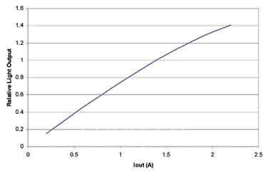 图2显示了作为工作电流函数的相对光输出(光通量)。很明显,光输出与二极管电流是密切相关的,因此可以通过改变正向电流进行调光。并且,在电流较小时,曲线几乎是一条直线,但是在电流增大时,其斜率变小了。这就是说,在电流较低时,若将二极管电流增大一倍,则光输出也会增加一倍;但是电流较高时,情况就截然不同了:电流上升100%仅能使光输出量增加80%。这一点很重要,因为LED是由开关电源驱动的,这会导致在LED中产生相当大的纹波电流。实际上,电源的成本在某种程度上是由所允许的电流大小决定的,纹波电流越大,电源成本就越低,但光输出会因此受到影响。