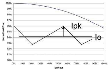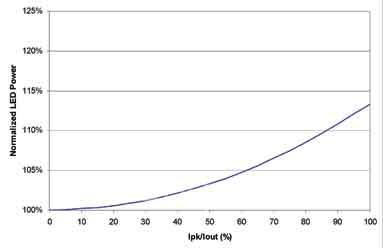 图3量化显示了叠加于直流输出电流之上的三角纹波电流所引起的光输出减少。在绝大多数情况下,该纹波电流的频率高于肉眼可以看到的80Hz。并且,肉眼对光线的响应是指数式的,不能察觉出小于20%的光线减弱。因此,即使LED中出现相当大的纹波电流,也不会察觉出光输出的减少。