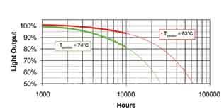 图4 高结温会缩短LED的使用寿命此外,纹波电流还通过提高功耗而影响LED性能,这可能导致结温升高,而且对LED的使用寿命有重大影响。如图4所示,LED的相对光输出是时间和结温的函数。如果确立了LED的光输出为额定的80%,则LED的使用寿命将从74℃时的10 000小时延长到63℃时的25 000小时。