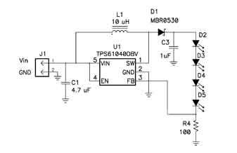 图8 降压-升压电流可限制和处理广泛的输入范围当输出电压总是比输入电压大时,最好是采用如图7所示的升压转换电路。该电路的U1中也有一个带有控制电子器件的高度集成电源开关。当开关闭合时,电流流经电感到接地。当开关断开时,U1引脚1上的电压会不断升高,直到v1导通,然后电感放电,电流进入输出电容器(C3)和LED串。在大多数应用中,C3通常用于平滑LED电流。如果没有C3,则LED 电流将是断断续续的。也就是说,它会在零和电感电流之间切换,这会导致LED热量增加(从而缩短使用寿命),并且亮度减少。在前面的例子中,LED的电流是通过一个电阻检测的,并且占空比会发生相应地变化。请注意本拓扑存在一个严重的问题,即它没有短路保护电路。若输出短路,则会有较大的电流通过电感器和二极管,从而导致电路故障,或者输入电压崩溃。