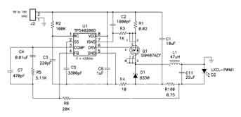 很多时候输入电压范围变化很大,其可以高于或低于输出电压,此时降压拓扑和升压拓扑结构就不起作用了。并且,可能在升压应用中需要短路保护。在这些情况下,就需要使用降压-升压拓扑结构(见图8)。当电源开关闭合、电感有电流通过时该电路就相当于升压电路;当电源开关断开时,电感开始放电,电流进入输出电容和LED。不过,输出电压不是正的,而是负的。此外,请注意本拓扑中不存在像升压转换转中出现的短路问题,因为电源开关Q1开路能提供短路保护功能。该电路的另一个值得注意的特性是,虽然其是一个负的输出,但并不需要对传感电路的电平进行转换。在本设计中,控制IC接地到负的输出,并且可直接测量电流检测电阻R100上的电压。尽管本例中仅显示了一个LED,但是通过串联可以连接许多 LED。电压的上限是控制IC的最大额定电压,输入电压加上输出电压的和不能超过该限值。