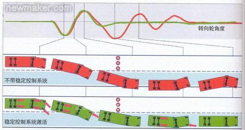 ESC的工作过程见上图,当车辆在低附着系数路面上避让障碍物时,不带稳定性控制系统转向轮向轮角度调整非常大,但仍然无法避免车辆滑出车道,而且整个过程中车辆也有折叠的危险。当稳定性控制系统激活时,转向轮角度调整不大,和正常道路上避让障碍物的调整情况类似。