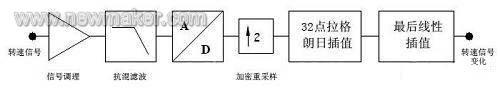 达到上述采样间隔后,利用可靠、精确的拉格朗日多项式插值法(16阶),再进行32倍插值。此时,对原始转速信号的估计,达到76ns的时间分辨率。而最初的ADC采样率为204.8KHz(4.9ms的时间分辨率)。最后,对拉格朗日插值后的采样信号再进行检测,查找其“+”、“-”值的转换点,并用线性插值法确定精确的过零时刻。由于最后一步的线性插值是在超高的过采样后进行的,可以认为输入数据具有极好的线性度,它有效地保证了最佳的RPM精度。仿真处理表明,理论上,QTV处理的时间分辨率等效于工作在几个GHz的计数器。