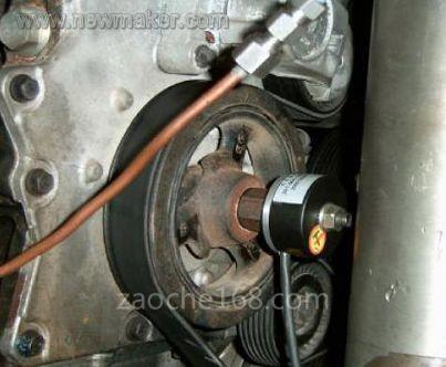 为了克服上述缺点,我们采用长春第一光学有限公司生产的ZKT-56A-120B-G12E型光电编码器。该光电编码器每转输出120个脉冲,采用通孔形式,用键槽固定。整个编码器的质量<0.1kg。为了与曲轴前端连接,采用一个两端螺纹的螺栓,一端直接与曲轴螺纹孔相连,另一端用于固定光电编码器,因此在现场安装非常方便。