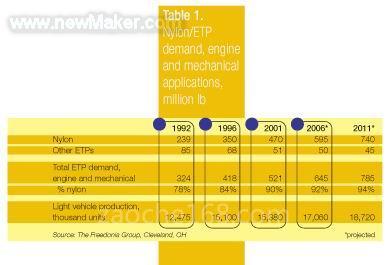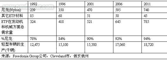 表一:尼龙/ETP在发动机和机械应用中的需求量(百万英磅)