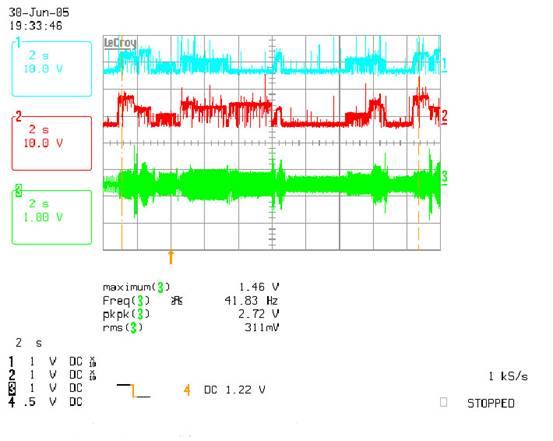 注塑机主要用于热塑性塑胶的成型加工。注塑机成型流程是一个按照预定的周期性动作过程,一个完整的生产周期主要包括合模、锁模、射胶、保压、熔胶、冷却、开模、顶出制品几个阶段,以此次测试之时序,即以合模射座进射胶加料冷却射座退开模顶针等程式达到产品成型。如图一所示为注塑机成型流程的电流输出波形。注塑机通常采用液压传动,其结构包含注射装置、开合模装置、液压传动装置和电气控制装置。电气控制装置的作用是保证注塑机的压力、速度、温度、时间、位置和动作程式参数等工艺准确有效地工作,在每个工作阶段均能符合工艺要求。注塑机合模→射座进→射胶→加料→冷却→射座退→开模→顶出的工艺参数同步工艺要求案例如图1所示。