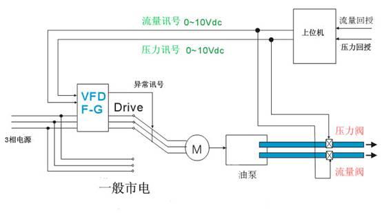 台达VFD-G变频器利用注塑机原有流量与压力控制信号,将注塑机原有定量泵改为节电型变量泵的电气控制装置。通过注塑机控制器提供工艺同步运行讯号,利用变频原理改变电机转速来改变油泵的输出流量,在满足注塑机在各个工作阶段所需速度的前提下,降低液压系统回流,使原有定量泵成为节电型变量泵,节能效率高达20~60%;并具有操作简便、控制速度准确稳定等特点;软性启动装置,减轻开锁模震动,避免设备冲击及磨损,延长设备使用寿命;以及能减轻电机噪音等效应,适用于各种功率,型号的注塑机种。根据注塑机的工作要求,利用注塑机上位机(例如电脑或PLC)的同步控制信号及电气控制,送出类比信号(0-10VDC的类比电压信号),直接加在台达VFD-FG变频器变频器的输入端,从而改变变频器的输出频率,即改变油泵电机的转速,来改变油泵电机的输出流量,满足注塑机在各个工序中所需的油压大小和流量速度,将传统的定量泵转变为变数泵,注塑机变频控制系统方块图如图2所示。