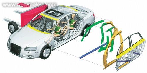 奥迪A6的车身强度和钢度一直备受赞扬,国产全新奥迪A6L在原有基础上进行了再次改进:采用了激光拼焊技术的车身设计(如图3)。新奥迪A6L经过强化的车身,其抗扭转强度提高了34%。配合全新的车身、底盘设计加之采用先进激光焊接技术的坚固车身结构,使国产全新奥迪A6L在遭遇碰撞时,预测的车身变形区、侧面防撞保护梁以及合理的车内空间结构等能够为乘客提供有效保护。这些看不到摸不着的设计和选材不但能降低车辆的制造成本和重量,还能在关键时刻最大限度地保护乘客的生命安全。